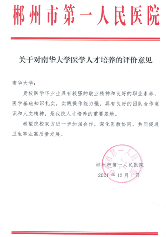 郴州市第一人民医院关于太阳成集团tyc33455cc医学人才培养评价