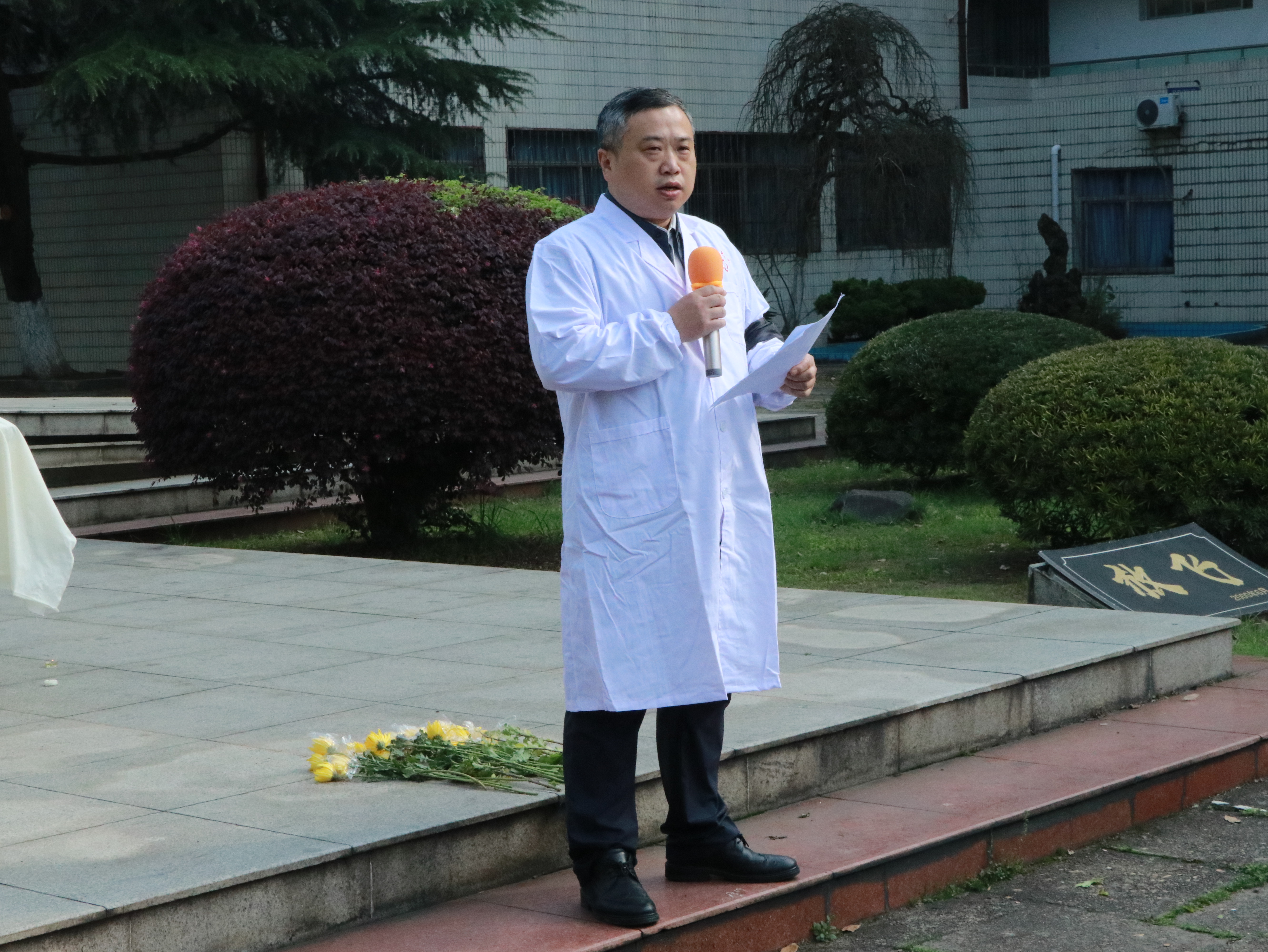 4月1日上午,为加强对医员工的医德医风和医学人文素质培养,帮助医员工树立对大体老师的尊重与感恩之情,太阳成集团tyc33455cc在红湘校区医学楼前举行清明节向大体老师默哀活动。基础医公司党委副书记卢清华、副经理谢巍、人体形态学中心教师代表以及衡阳市红十字会志愿者代表等受邀参与仪式,院团学会、院解剖兴趣小组和各班同学代表共两百余人参加